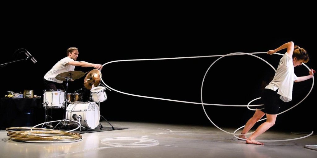 Kajaanista Kuuhun combines hoop manipulation and live drums, directed by a visual artist. It is a dispute between the two performers and their respective equipments. It is an imaginary journey from the small Finnish town of Kajaani, all the way to the Moon. During the journey we experience long limbs, loss of gravity, moonquakes, rattle and electric shocks.